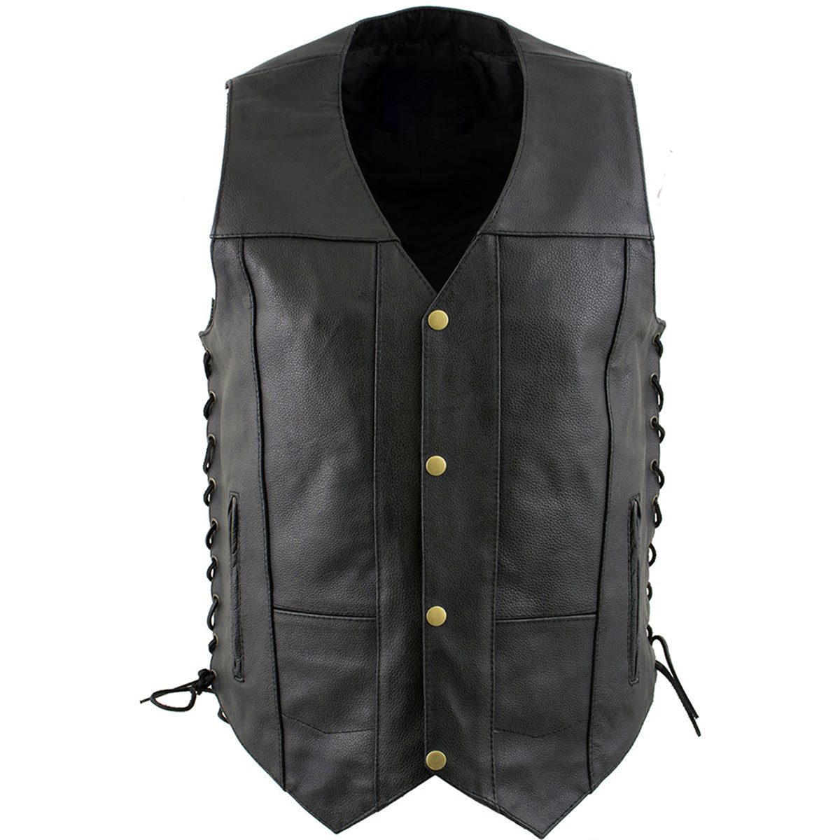 A durable, sleeveless motorcycle vest made from premium leather, featuring adjustable side laces or snaps for a tailored fit.